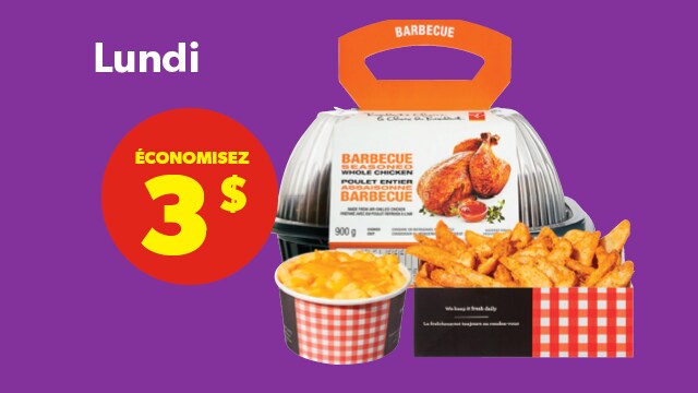 Poulet de rôtisserie avec deux petits accompagnements pour 15 $