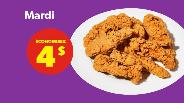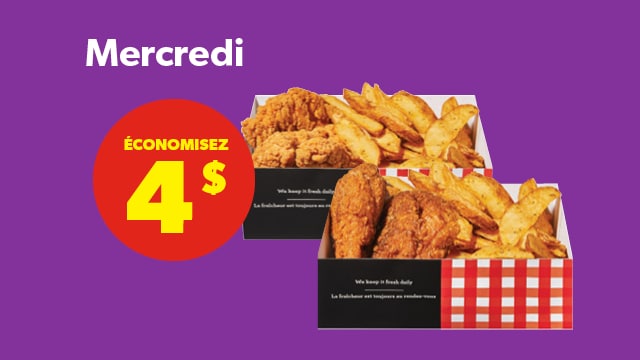 Achetez un repas de poulet ou de côtes levées et une boisson Pepsi de 1 litre pour 20 $. Tous les repas sont accompagnés de pommes de terre en quartiers et de macaronis au fromage.
